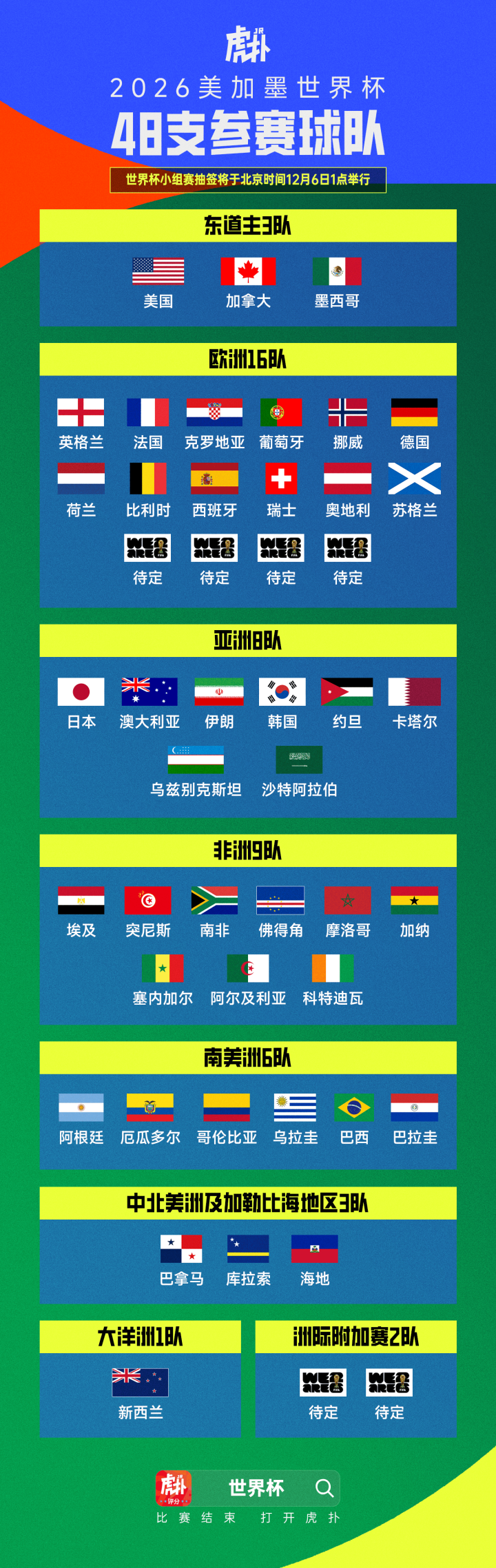 虎扑11月19日讯跟着中北好意思世初赛第三阶段比赛落下帷幕,2026年好意思加墨天下杯总共纵贯的42支球队一王人出炉。剩余6个限额将在欧洲区附加赛(4个)和洲际附加赛(2个)中产生。