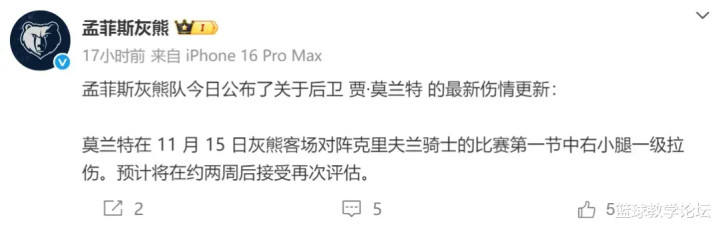 然而指摘区的球迷认为,灰熊此举仅仅为了保护莫兰特,正经他在交往之前受伤。莫兰特受伤不假,跟灰熊闹翻亦然事实。咱们一件一件来说:11月16日灰熊和骑士的比赛中,莫兰特只打了6分钟,因为小腿酸痛提前退赛。