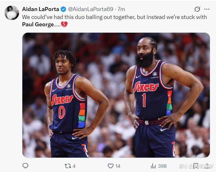 费城媒体Aidan LaPorta写谈:咱们本不错络续看到马克西+哈登的盖世扮演体育录像/图片,可如今咱们只可看保罗-乔治,太心碎了。