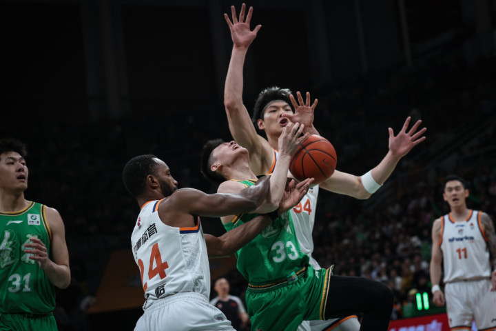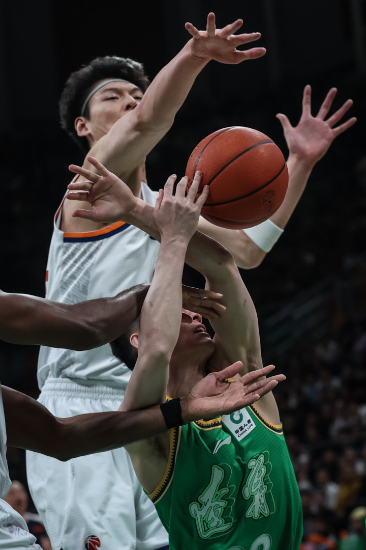 12月31日,上海久事队球员张镇麟(中)在比赛中冲突受阻。新华社记者潘昱龙摄