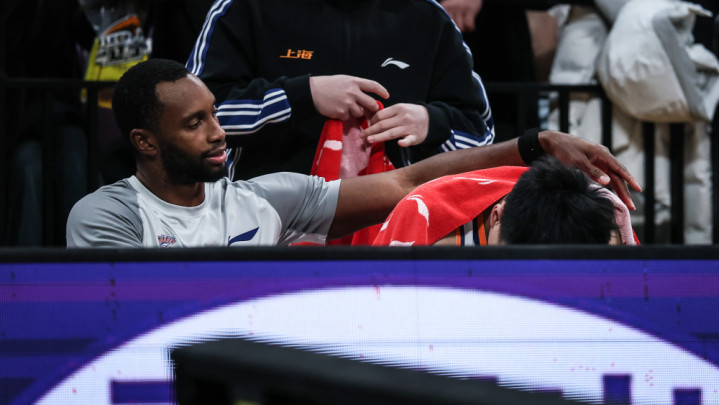 12月31日,赛前辽宁本钢队现场播放对于张镇麟和弗格的追念视频,张镇麟(右)不雅看时落泪。上海久事队球员弗格在一旁安危。新华社记者潘昱龙摄