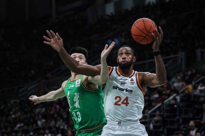 12月31日,上海久事队球员弗格(右)在比赛中伏击。新华社记者潘昱龙摄