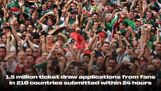 预售抽签敞开仅24小时,FIFA就收到了来自环球各地的多数央求,已有来自210个国度的稀奇150万名球迷完成注册。