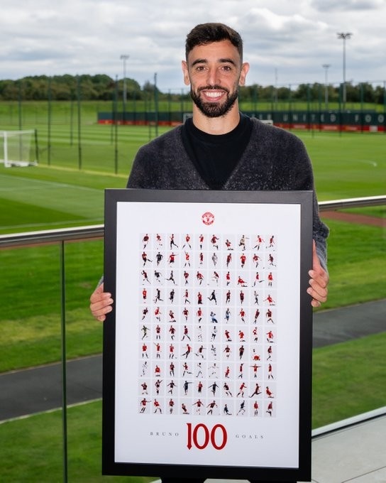 直播吧9月25日讯 曼联足球总监贾森-威尔科克斯向B费调停了一件装裱好的艺术品,以挂念他为曼联打入的第100粒进球。B费在卡灵顿测验基地的餐厅里,在队友和职责主谈主员眼前领取了这份礼物。