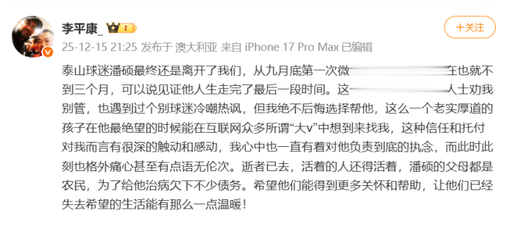 虎扑12月15日讯被戴琳拖欠救命钱的山东球迷潘硕离世后,媒体东谈主李平康谈到了潘硕事件。