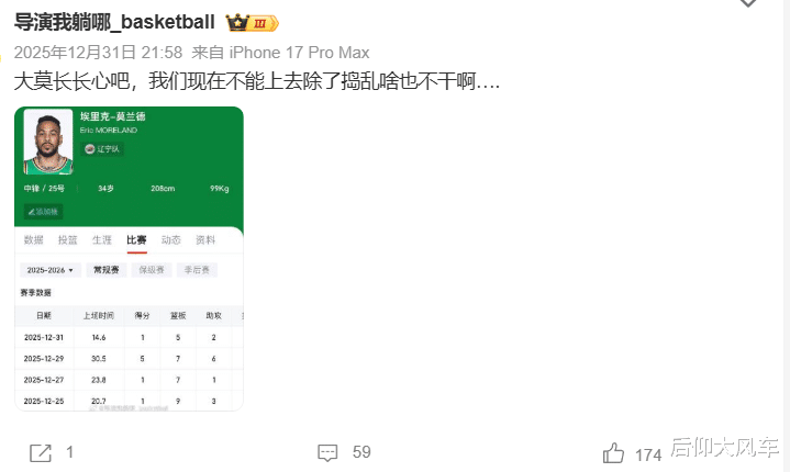 辽宁球迷叱咤莫兰德是少许用王人莫得!辽宁队当初签回莫兰德是咋想的?护框不中用,迫切又吃瘪;就连一向站在辽宁这边的“著明”媒体东说念主导演,也忍不住提及了莫兰德:长长心吧,不可上去除了淆乱啥也不干啊!