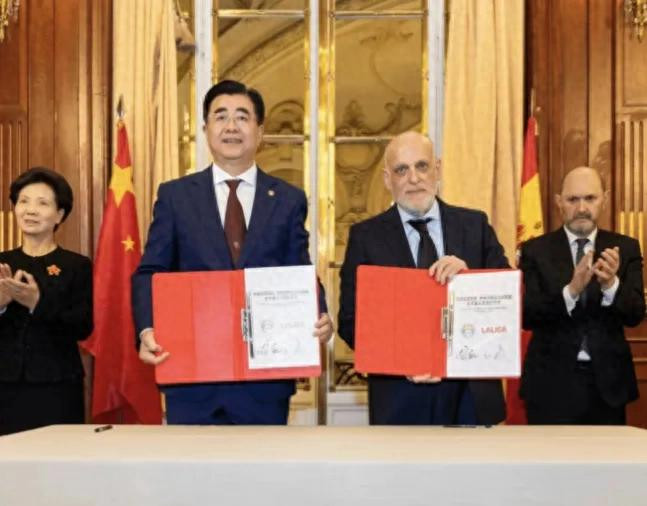在此时辰,中国足协主席宋凯与西甲主席哈维尔・特瓦斯签署了为期三年的合营框架公约。